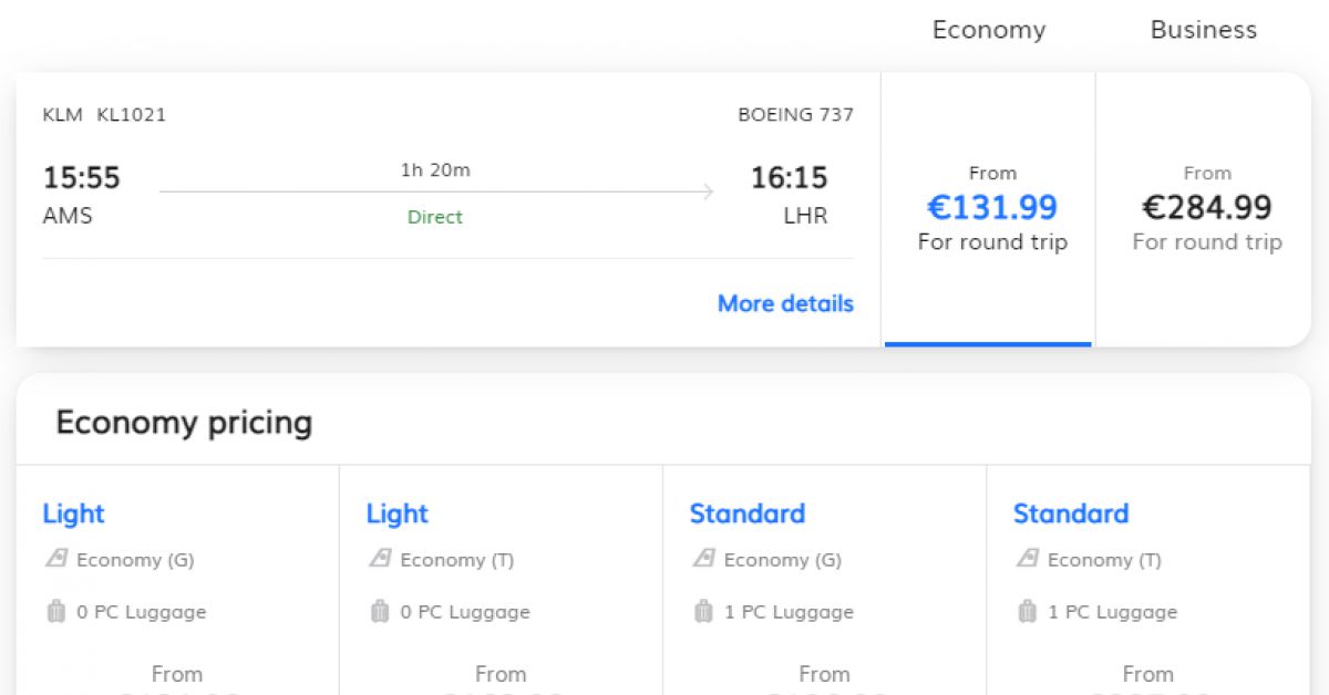 Als je eenmaal een vlucht gevonden hebt, dan kun je kiezen uit een reeks van prijzen met daaraan gekoppelde voorwaarden.